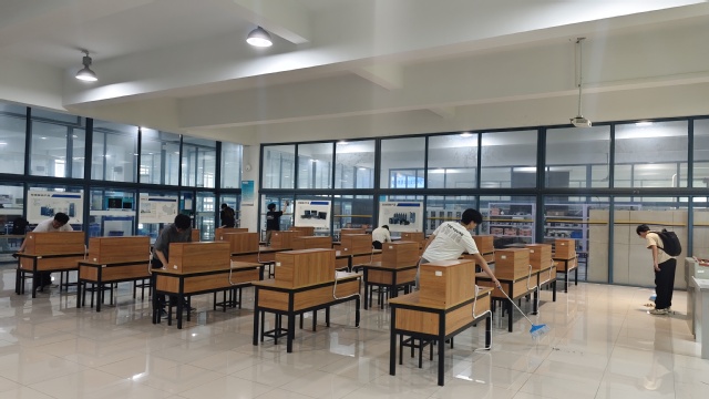 大飞机实践教学基地是学院航空专业教学的重要载体,大飞机是学生接触航空装备、开展实践操作的“活教材”。入党积极分子们分工协作,手持清洁工具对飞机机舱进行整理与打扫,并清理飞机周边杂草和杂物。面对驾驶舱精密仪器的清洁任务,同学们在专业教师指导下小心翼翼操作,确保不留死角、不损设备。在发动机拆装实训室与钣金成型实训室内,志愿者们直面专业实践的“硬核”挑战,开展深度去污,并对工作台、铆接设备及周边区域实施标准化整理,还原安全规范的操作环境。实训教室内设备精密、器材繁多,志愿者们按区域划分小组,对操作台、仪器设备、工具柜进行除尘保养,整理线缆和零部件,归类教学资料。经过2小时奋战,原本略显杂乱的实训室焕然一新,地面光洁如镜,设备陈列有序。