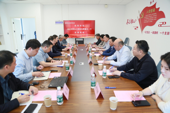 4月16日下午,扬州市职业大学党委副书记、校长周春光,党委委员、副校长吴书安一行7人来校调研交流,威尼斯官网党委副书记、校长何学军,党委常委、副校长魏萍在双创大楼三楼会议室接待了来宾,相关职能部门负责人陪同接待。