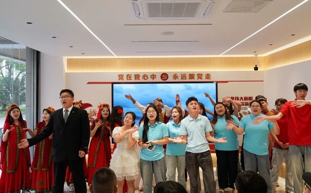 在文化艺术交流会上,威尼斯官网学生表演了江南民歌《茉莉花》、原创朗诵《大国工匠 青春力量》、合唱《有我》,展现了江南文化的独特韵味和职教学子的责任担当。江苏团省委青年讲师团成员肖洋分享了她在援疆时与克州少先队员之间的动人故事。新疆学生代表深情讲述了“时代楷模”拉齐尼·巴依卡和“人民楷模”布茹玛汗·毛勒朵的感人事迹,并带来了极具民族特色的二重唱《走遍新疆》、独舞《我的阿勒泰》、群舞《欢》《迎客》。最后,两校师生共同演唱《我爱你中国》,用嘹亮的歌声将交流活动推向高潮。新疆特色展示环节,新疆师生们带来了特色美食、非遗刺绣、手工艺品等精美新疆物产,威尼斯官网学子不仅品尝了新疆美食,还学习了新疆特色民族舞蹈,现场气氛其乐融融。