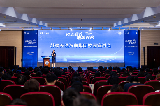 会谈结束后,与会人员共同前往报告厅参加苏豪天泓汽车集团有限公司校园宣讲会。苏豪天泓汽车集团有限公司人力资源部负责人系统介绍了集团的业务和“苏豪天泓班”的遴选要求等,天泓小米汽车华胜店负责人介绍了汽车新媒体的发展现状、未来趋势以及新能源汽车未来的技术发展趋势等。最后苏豪天泓人力资源部负责人还介绍了苏豪天泓的福利待遇及未来职业生涯规划等,得到了与会同学的热烈响应。