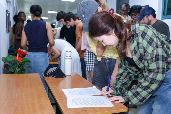 大会伊始,学工办教师发布暑期学院文化交流、社会实践及志愿服务等多元活动的安排,鼓励留学生丰富假期生活积极参与。学院精心设计暑期实践计划:一场文化之旅:留学生探访南京非遗文化传承基地 ;一次社会实践:留学生开展志愿服务活动。学院还就下学期开学报到、学费缴纳、课程表核对等重要事宜进行了详细说明,以便留学生能够提前做好准备,顺利迎接新学期的到来。随后,会议重点强调了暑期安全的重要性。王亚雯通过典型案例解析,重点强调交通安全、人身安全、财产安全及饮食安全,提出防中暑、防意外和防诈骗。同时针对暑假期间留校学生的宿舍安全管理事项进行了详细解读。会上,学生签订了暑期留校安全承诺书。