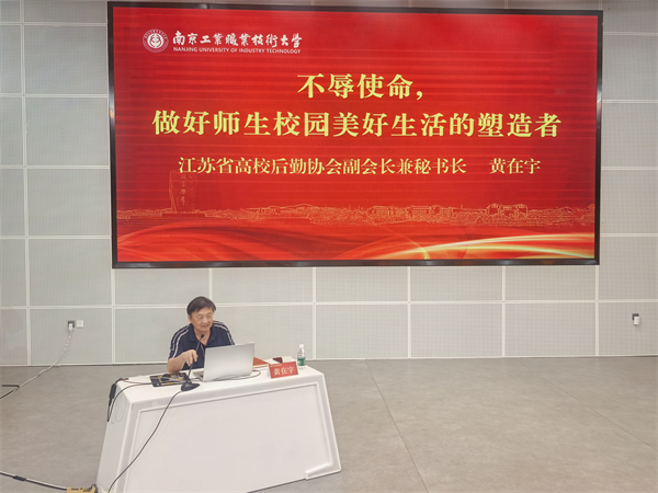 黄在宇作《不辱使命,做好师生校园美好生活的塑造者》主题报告。他结合高校后勤工作实例,首先讲述了高校后勤承担的历史任务和使命,接着强调后勤人应具备的奉献精神、育人意识、高度责任心、沟通能力、良好职业道德五大素质和创新、应急处置、团队协作三大能力,最后鼓励后勤人员积极探索结合工作岗位做师生美好生活的塑造者。