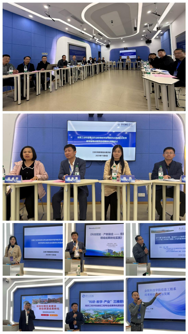 本次研讨会上,东软教育科技集团总裁、大连东软信息学院董本清教授以《科技赋能・产教融合——东软教育信息通信领域成果转化实践》为题,分享了企业在推动教育链与产业链对接中的实践经验。广州轻工业职业技术大学现代通信技术专业教研室主任陈岗围绕“三教”改革,系统阐述了在“广轻工-华为ICT创新人才培养基地”建设中,如何实现人才培养与产业服务协同发展的有效路径。福建信息职业技术学院物联网与人工智能学院副院长张智群以《双高引领五金建设,推动资源成果转化》为题,介绍了该校在“双高计划”背景下推进资源整合与成果落地的具体举措。南京工程学院通信与人工智能学院、集成电路学院通信系主任杨伟博教授则提出“科研—教学—产业”三维联动机制,系统展示了该校通信工程专业在成果转化方面的探索与成效。金陵科技学院电子信息工程学院信息工程系副主任牛犇就该校信息工程系的成果转化实践与发展路径作了交流汇报。