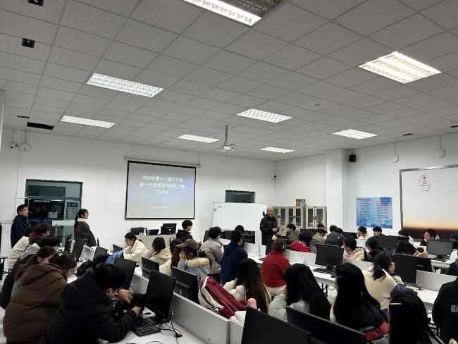 董鹏、弓盼先后介绍了大赛的意义和学院“以赛促学”的培养模式。高文鹏详细解读了赛制、赛道及报名事项。会议特邀2025年“大唐杯”国赛一等奖获得者、学院学生倪冰清分享参赛经验,从组队、备赛、技术攻关等方面进行讲解,鼓励同学们积极参赛、锻炼能力。骆静强调了团队协作与备赛纪律。互动环节中,学生围绕组队、选题等问题,与老师、学长深入交流,现场气氛热烈。