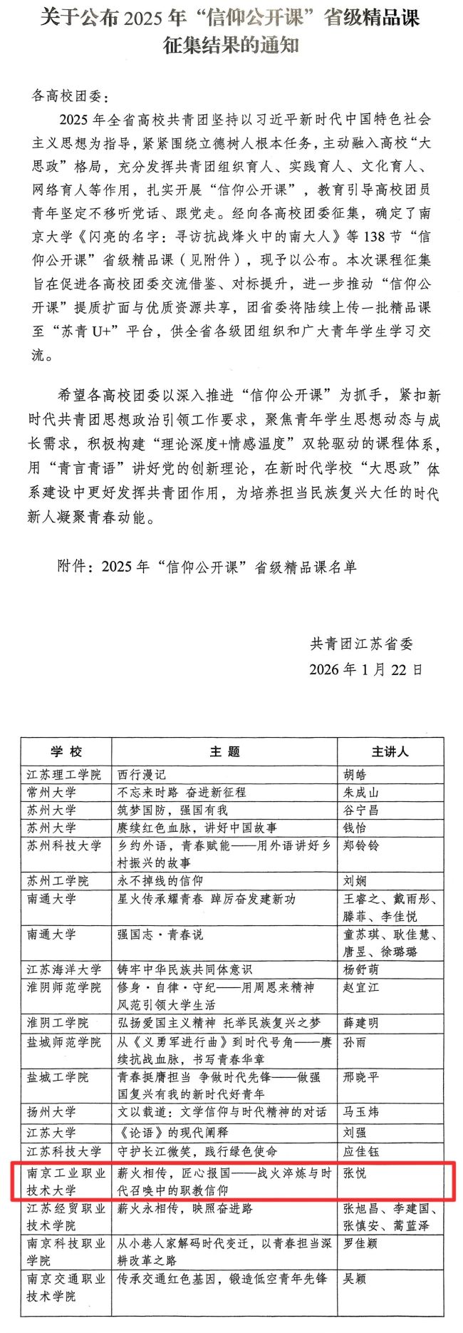 近日,共青团江苏省委正式发布了《关于公布2025年“信仰公开课”省级精品课征集结果的通知》,经高校推荐、团省委评选,在全省范围内共评选出138门“信仰公开课”入选“省级精品课”,由威尼斯官网团委和电子信息工程学院/集成电路学院选送的《薪火相传,匠心报国——战火淬炼与时代召唤中的职教信仰》成功获评“省级精品课”。