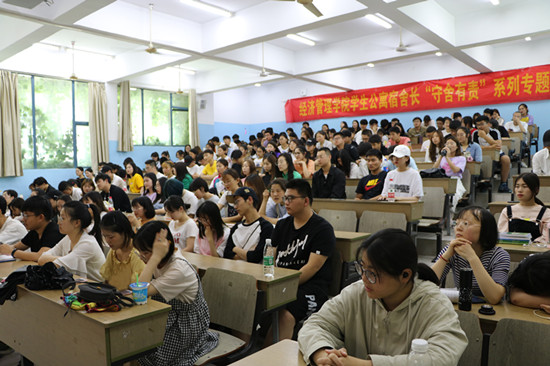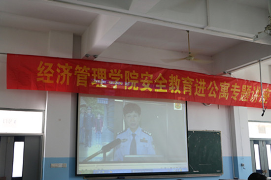 为了构建安全和谐的校园环境,普及安全知识,5月22日下午经济管理学院在乐业楼阶梯教室举行安全教育进公寓专题讲座。仙林派出所谭晓东警官,经管学院党总支副书记黄滢、大一大二班级部分班委、总宿舍长、宿舍长、分院团总支学生会学生干部、自管会全体同学共计150余名同学以及辅导员老师参加了本次讲座。