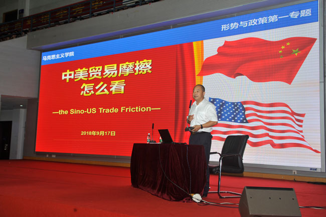 当前,中美贸易摩擦日益白热化,网上观点鱼龙混杂,为了帮助青年大学生正确认识中美贸易摩擦的来龙去脉,明确我国应对贸易摩擦的总体方针和具体策略,批驳网上网下的各种错误言论,引导学生增强“四个意识”,坚定“四个自信”,本学期的“形势与政策课”将“中美贸易摩擦辨析”作为第一专题,于书记以正确看待中美贸易摩擦为切入点,通过把握世界转型过渡期国际形势的演变规律、西方专家学者对中国的认知、美国对华政策的变化、我国的应对策略等方面客观、理性的讲解了中美贸易摩擦的背景、现状及应对举措。于书记强调正确认识和妥善应对国际格局变化和贸易摩擦,事关我国改革发展稳定大局。以习近平同志为核心的党中央高度重视、精心部署,有理有节、综合施策,坚定捍卫国家核心利益和民族根本利益。