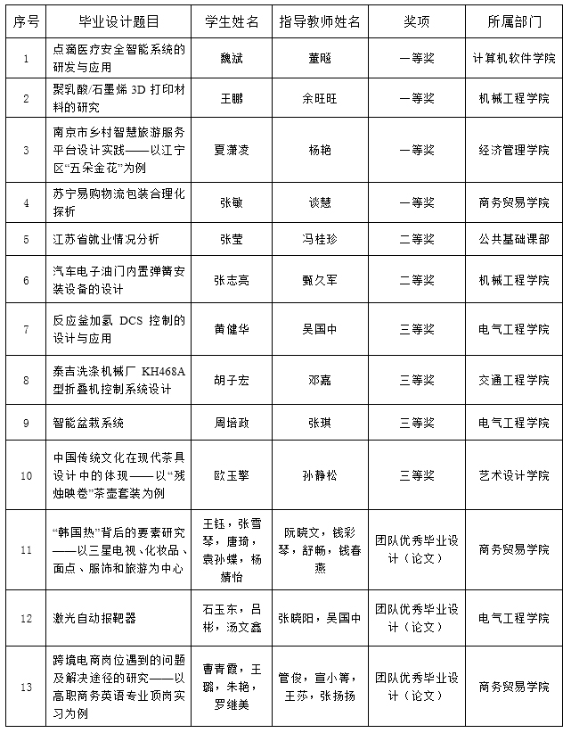 近期获悉,根据《省教育厅办公室关于做好2016年普通高校本专科毕业设计(论文)评优与抽检工作的通知》(苏教办高〔2016〕7号)要求,学校创新毕业设计省级推优办法,在学校推荐的基础上,经专家评审、结果公示和省教育厅审定等程序,威尼斯官网所推荐参加普通高校本专科毕业设计(论文)省级评选的十三篇论文(个人申报10项,团体申报3项),获得个人一等奖4项,二等奖2项,三等奖4项,团体奖三项,获奖率100%,成为一等奖获奖量和获奖总数最多的高职院校,名列全省首位,创学校历史新高。