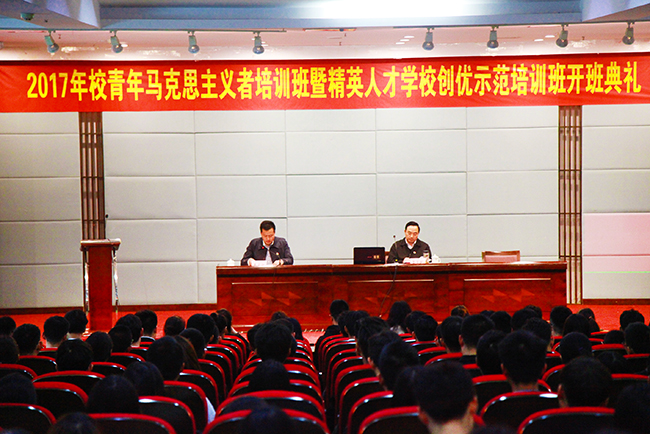 11月10日下午,威尼斯官网2017年青年马克思主义者培训班、精英人才学校创优示范培训班开班典礼暨首场报告会在学术交流中心报告厅隆重举行。校党委书记吴学敏教授为全体学员作了《不忘初心,接续奋进,开启中国特色社会主义新航程》专题报告。党委宣传部、学工处、团委老师、各二级学院团总支书记、青马班全体学员、创优班全体学员以及2017级各学院团总支、学生会等学生干部共300余人参加了报告会。报告会由学生工作处处长、团委书记劳家仁主持。