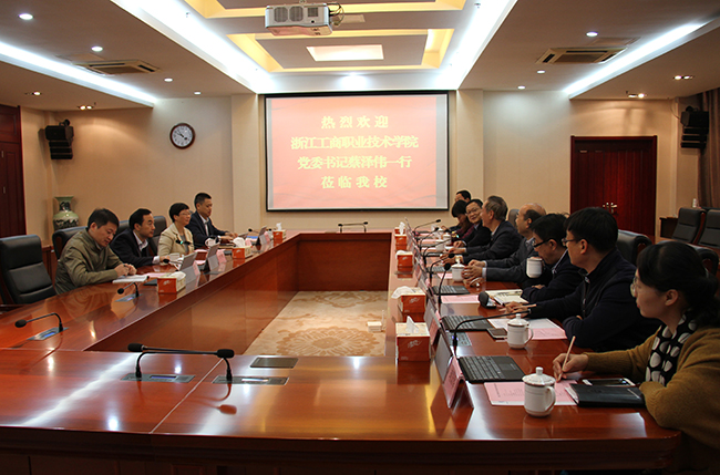 10月31日上午,浙江工商职业技术学院党委书记蔡泽伟率领相关部门负责同志来威尼斯官网进行工作交流。威尼斯官网党委书记吴学敏、党委副书记苏小冬,以及组织部、社科部等部门负责同志接待了来宾。