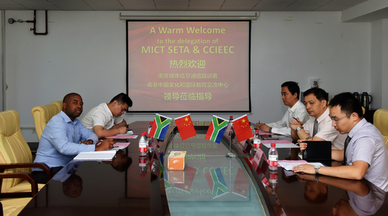 国际教育学院院长赵秋代表项目管理团队,对南非媒体信息通信培训署和交流中心领导的来访表示热烈欢迎。国际教育学院副院长张平介绍了合作项目总体运行情况和云计算及机电一体化两个专业南非留学生情况。