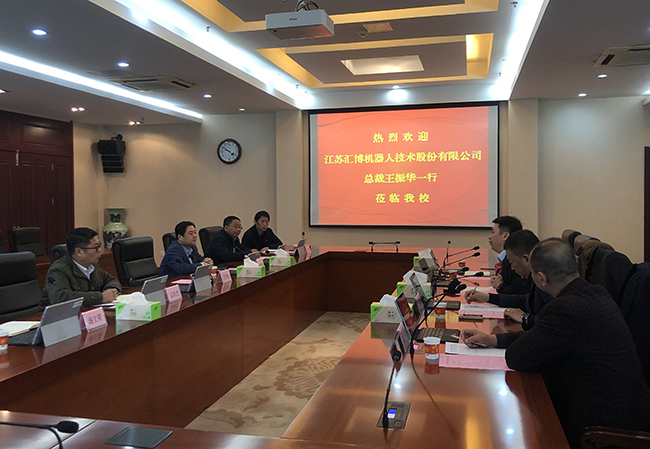 会上,崔新明向来宾介绍了学校的基本情况,王振华总裁介绍江苏汇博机器人技术股有限公司情况,随后双方就共建实验实训基地、合作培养双创人才等内容进行了深入交流。
