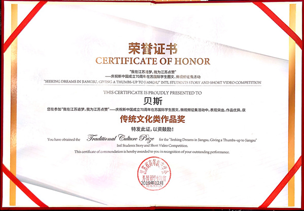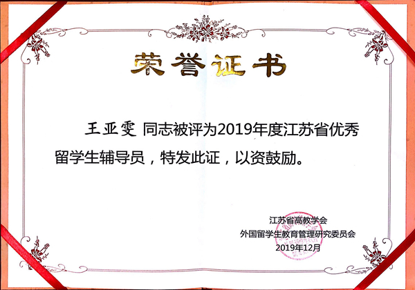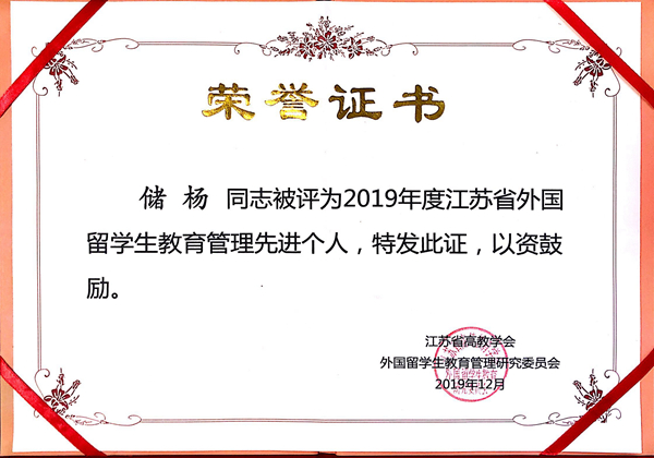 会上,江苏省高等教育学会外国留学生教育管理研究委员会副理事长俞晓南宣读了表彰决定。威尼斯官网国际教育学院储杨老师获得“江苏省外国留学生教育管理先进个人”称号,王亚雯老师获得“江苏省优秀留学生辅导员”称号,贝斯同学获得“我在江苏追梦,我为江苏点赞”——庆祝新中国成立70周年在苏国际学生图文、微视频征集活动“传统文化类作品奖”。