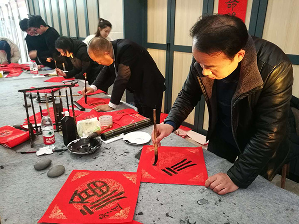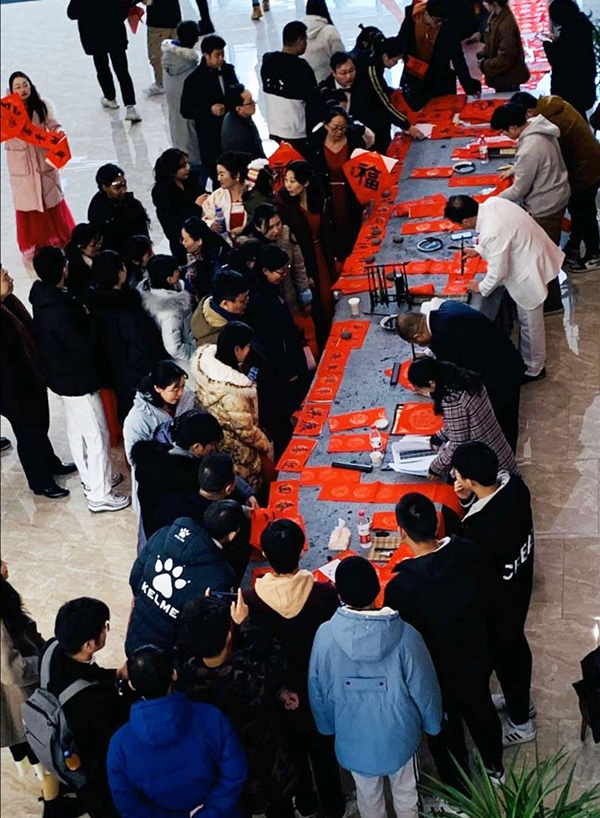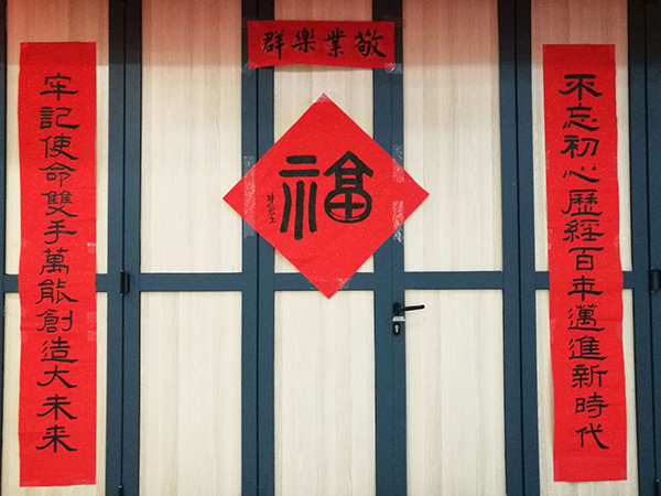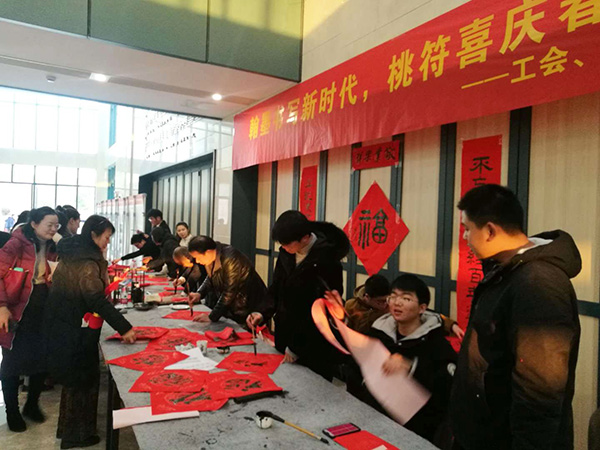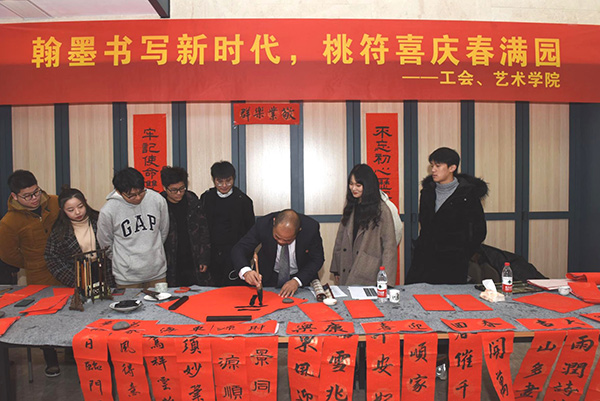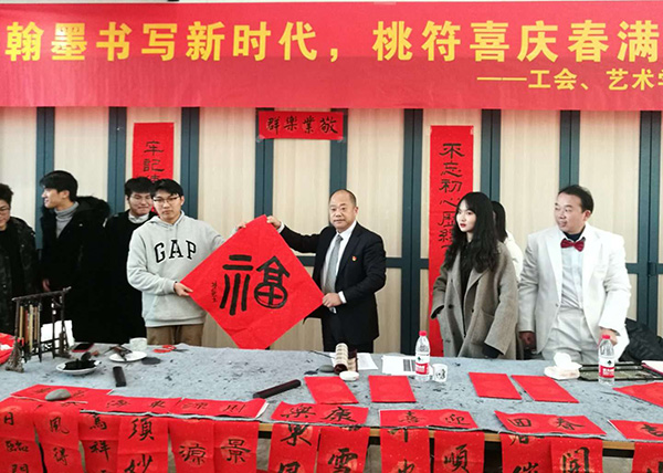 值此2020新年到来之际。南工院举行了辞旧迎新大联欢。工会,艺术设计学院,校书法协会联合举办了以“翰墨书写新时代,桃符喜庆春满园”为主题的送春联送福字活动。活动启动仪式由(全国)教育书画协会高等书法教育分会理事、校党委委员、纪委书记于林惠教授提笔书写“福字”开始,接着由(全国)教育书画协会高等书法教育分会会员、书法协会指导老师刘圣进书写自撰对联:不忘初心历经百年迈进新时代,牢记使命双手万能创造大未来。然后广大师生一起挥毫,数千师生积极参与。近年来,威尼斯官网书法艺术在三全育人,立德树人,增进学校文化氛围,提升师生文化自信等方面做了一些尝试,为学校文化育人作出了积极的贡献。通过这次活动,锻炼了书法协会同学们的动手能力,加强了广大师生员工的情感交流,也表达了书法协会新年深情的祝福:祝福祖国繁荣昌盛、人民幸福安康!祝福学校蒸蒸日上,又上新台阶!祝福全校师生新年快乐,万事顺意!