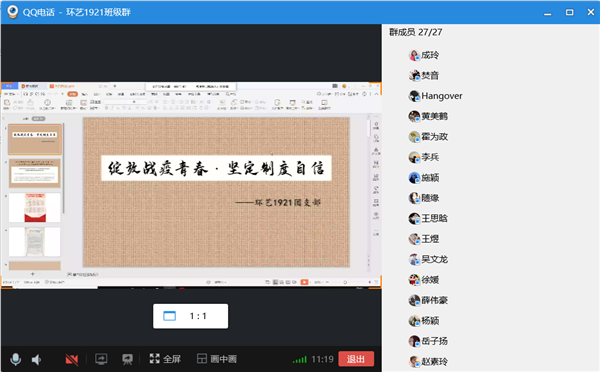 环艺1913团支部在支部QQ群中开展了这次团日活动,活动由团支部书记刘淇主持。同学们在QQ群中畅所欲言,分享自己的五四感悟,通过本次团日活动,支部团员对“五四运动”、“五四精神”有了更深刻的认识,增强了制度自信;视觉1912团支部书记高宇飞在团日活动中呼吁班级学生要减少不必要的外出与聚会,不轻信来历不明的防疫方法,不传播无法证实的虚假消息。遵循权威信源的专业建议,践行最合理的防疫方法,认真做好个人防护,在保护好自己的前提下践行五四精神,为打赢疫情防控阻击战贡献力量;数媒1911团支部使用企业微信云视频的方式开展了这次团日活动,同学们集体学习“五四运动”的知识,深入了解“五四精神”的时代内涵;室内1821团支部的青年团员们在活动中集体学习习近平总书记给北京大学援鄂医疗队全体90后党员的回信,支部的团员青年们手举标语口号,表示要坚定思想信念、明确行动方向,不忘初心、牢记使命、扛起责任、经受考验,争做新时代的南工院青年。
