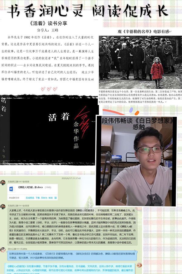 同学们通过线上音频、视频和阅读的方式,拉近了彼此之间的距离。活动过程中,同学们积极性都很高。许多同学记录了自己在阅读《影响力》《月亮与六便士》《偷影子的人》等经典名著的真切感受;软件1911班的段伟伟同学以视频的方式讲述了观看电影《白日梦想家》的感悟,让大家更深切地感受到他饱满的热情;软件1921班的林丹丹同学以音频的方式深情并茂的表达出《活着》这本书带给自己的心灵启迪。读书能打开我们的视野,也让我们体验到心灵的震撼,感悟到生命的美好。每周都有同学将自己心中的“人生之书”分享给大家,畅谈自己在读书过程中的所思、所想、所感、所悟,讲述书中最触动自己的地方,其他同学们参与评论并发表自己内心的想法,读书分享活动开展得有声有色。
