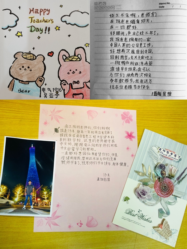 在这个温馨的节日里,学生们虽还未返校,但他们纷纷用打电话、发简讯、手绘贺卡的形式向老师们送去祝福,写下真诚的话语,表达对老师的敬意和感激。在境外的留学生们发来自己的近照以及祝福语,表达了他们对母校的思念和感恩之情。经师易遇,人师难遭。学生们借以简单的文字表达对老师们的爱。