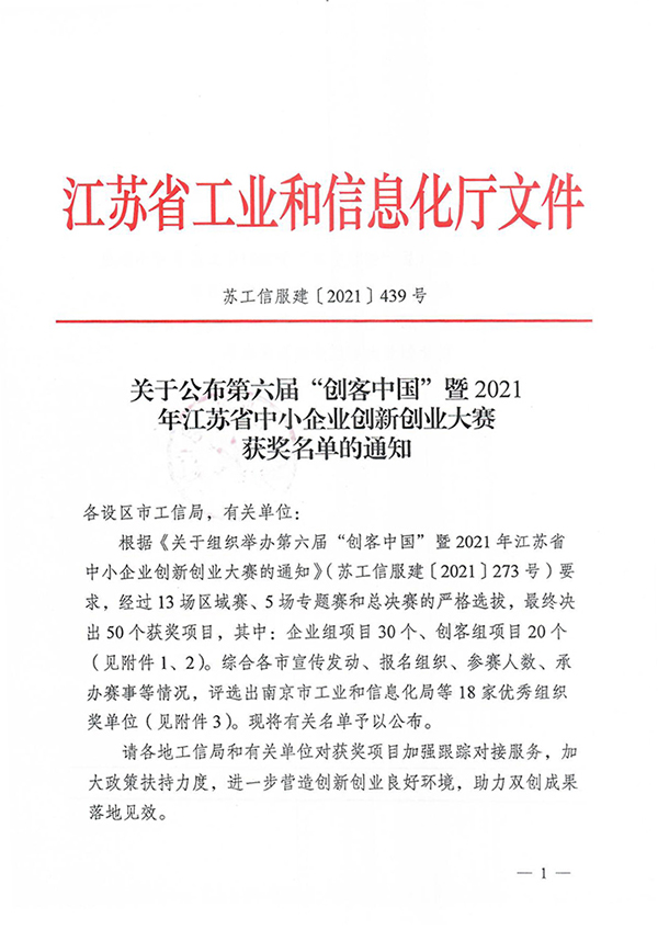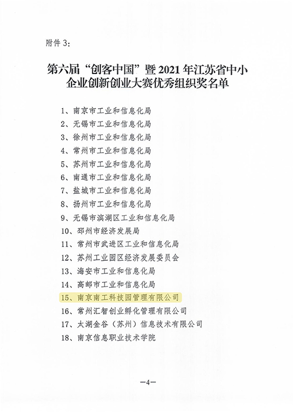 近日,第六届“创客中国”暨2021年江苏省中小企业创新创业大赛顺利落下帷幕,江苏省工业和信息化厅综合各市宣传发动、报名组织、参赛人数、承办赛事等情况,评选了大赛优秀组织奖,威尼斯官网大学科技园运营公司——南京南工科技园管理有限公司名列其中。