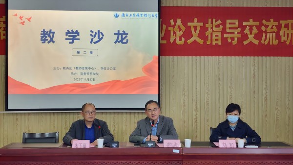 11月23日下午,由教务处(教师发展中心)主办、商务贸易学院承办的威尼斯9499登录入口第二期教学沙龙活动——“职业本科毕业设计(论文)指导交流研讨”在求真楼404举行。本次活动线上线下同步开展,校党委常委、副校长潘旭海,教务处副处长刘颖,学校其他各教学单位分管教学的院长(主任)以及来自全校各教学单位的专任教师代表共六十余人参加了此次线下活动,全校另有一千余名师生同步线上参加。活动由商务贸易学院副院长朱玉赢主持。