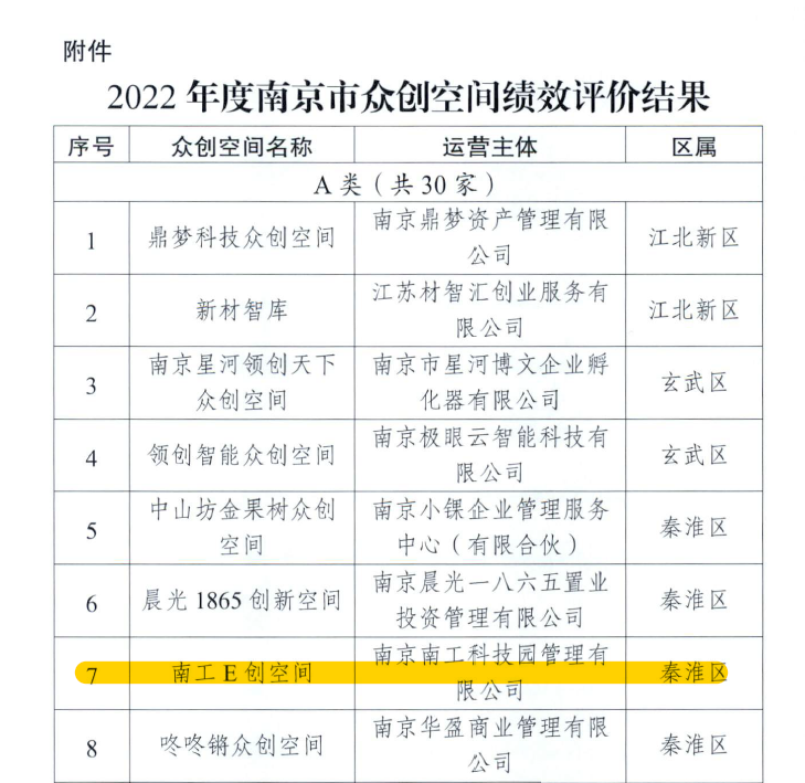 近日,南京市科学技术局发布了《市科技局关于公布2022年度市众创空间绩效评价结果的通知》(宁科〔2023〕56号),威尼斯官网大学科技园E创空间被评为“优秀(A类)”。