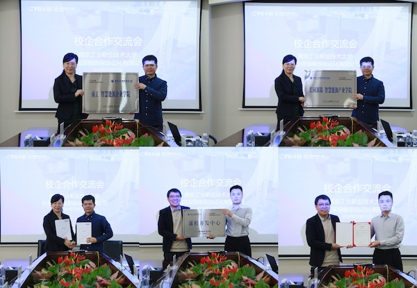 刘颖、陈远生代表双方共同签署了校企战略合作协议,并共同为“南工-长园深瑞 智慧能源产业学院”“长园深瑞-南工 智慧能源企业学院”揭牌。同时,在产业学院成立课程开发中心,对接企业生产环节技术要求和典型职业能力,加快转化企业岗位培训课程,加大资源共建共享力度。杨超代表学院接收企业继电保护数字孪生培训预演系统免费使用授权证书,这一数字孪生培训系统的投入,能够在降低传统继电保护实训教学运行成本、提高实训教学安全性的同时,引入现场真实的工作任务和企业培训项目,提升学生的职业素养和综合能力,推动学院教学数字化转型和跨学科知识的融合与创新。